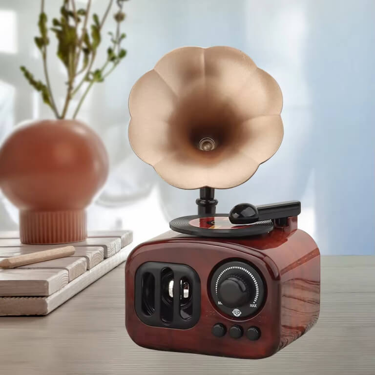 Minyatür fonograf şeklindeki müzik kutusu, geçmiş bir dönemi anımsatan nostaljik ve vintage bir çekicilik yayıyor.